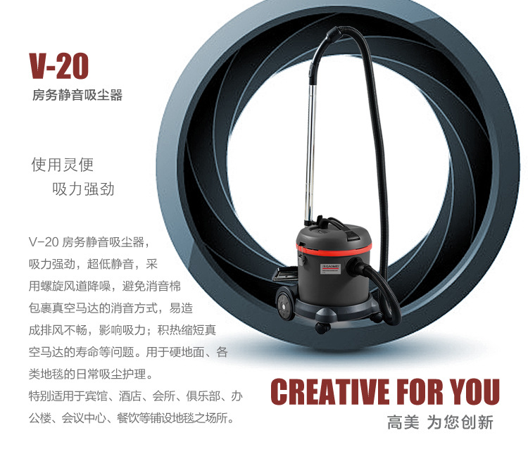 V-20 高美房務吸塵器,吸力強勁,超低靜音,采用螺旋風道降噪,避免消音棉包裹真空馬達的消音方式,易造成排風不暢,影響吸力;積熱縮短真空馬達的壽命等問題,用于硬地面、各類地毯的日常吸塵護理。特別適用于賓館、酒店、會所、俱樂部、辦公樓、會議中心、餐飲等鋪設地毯的場所。